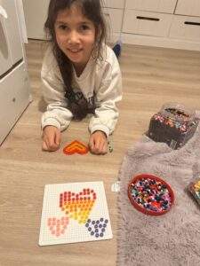 Loulou is vandaag al druk bezig met iets heel speciaals: hartjes maken van kralen, als