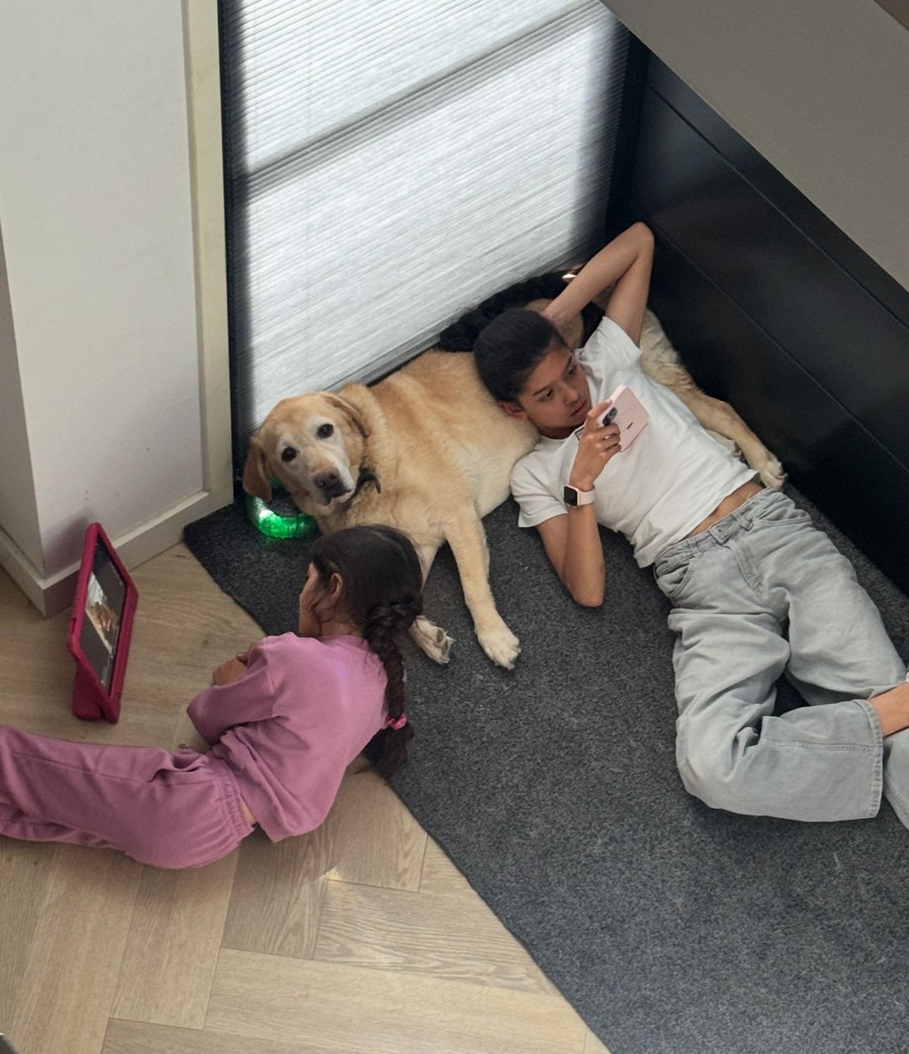 Want ik liep naar beneden en zag de meiden heerlijk met hun hond Nino te chillen en dat ze samen aan ‘t robloxen. Het deed mij weer herrinneren aan de tijd dat wij als ouders ook met de kinderen samen gingen Robloxen, met zijn allen samen in de wereld die Roblox heet🥰